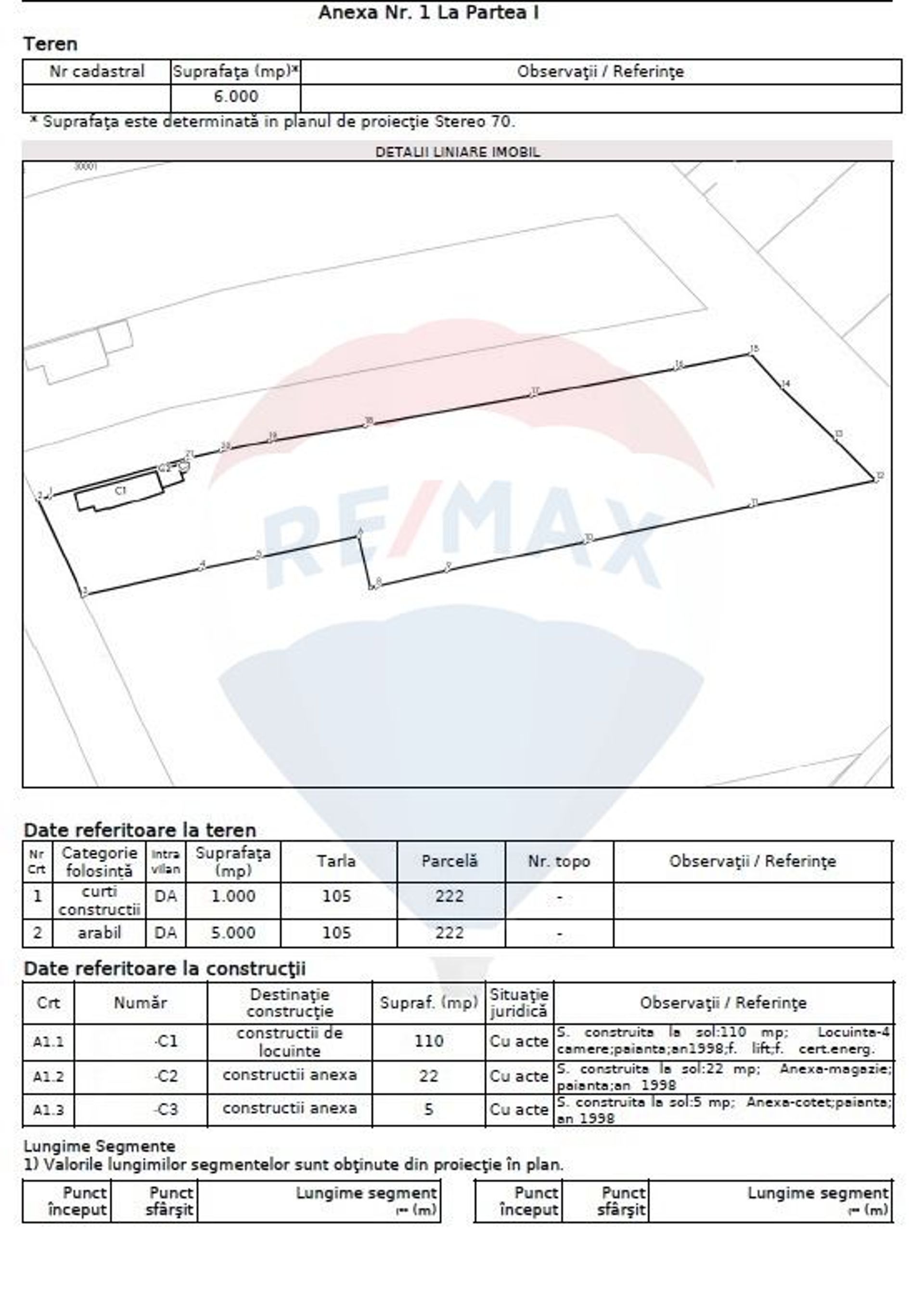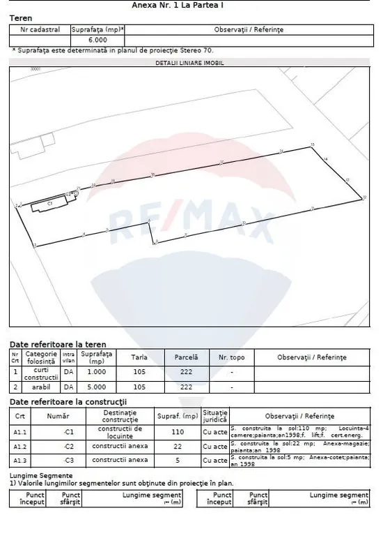 Conform documentatiei cadastrale, proprietatea include o suprafata de 1.000 mp destinata constructiilor si 5.000 mp teren intravilan cu folosinta agricola. Pe teren sunt edificate constructii intabulate, care pot fi renovate sau demolate, in functie de planurile viitorului proprietar.