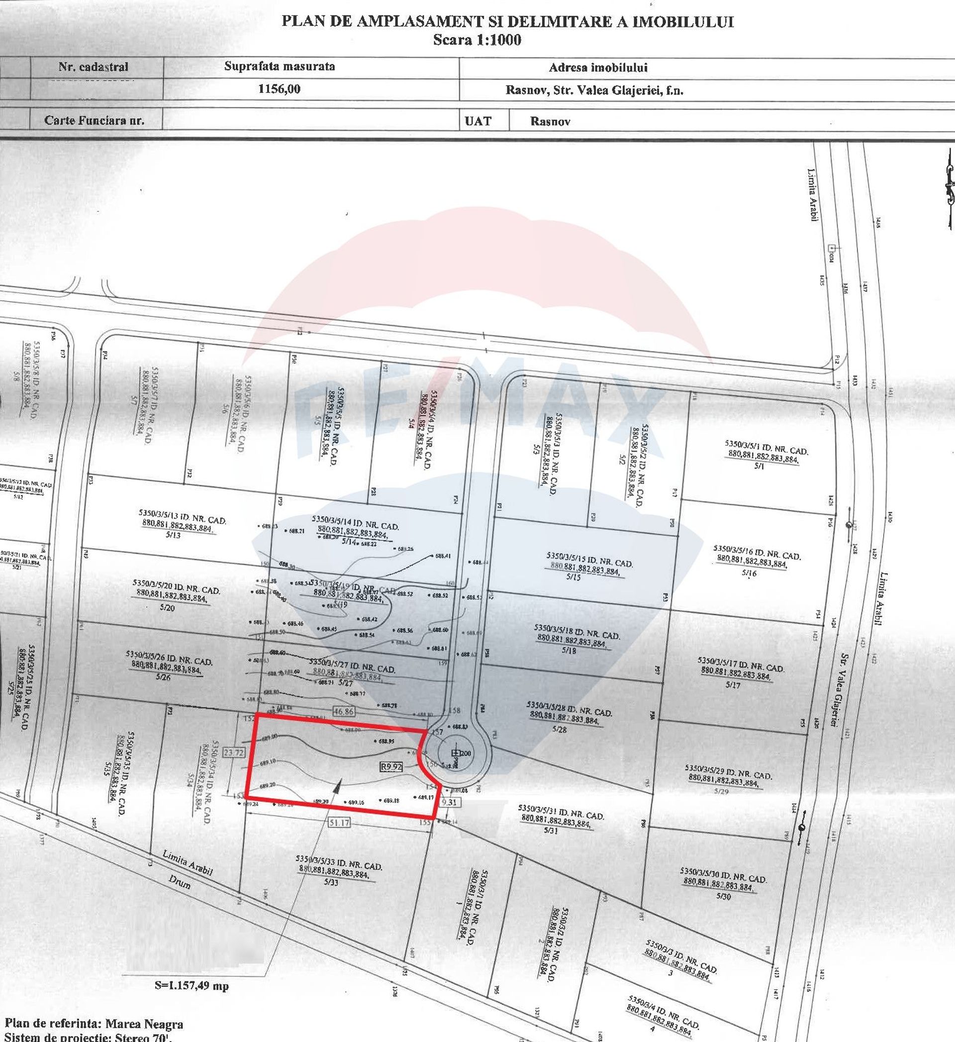 Compania Imobiliara RE/MAX Central va propune in vederea cumpararii in sistem de reprezentare exclusiva si comision 0% din partea cumparatorului un teren intravilan situat in Rasnov, zona Glajerie, la app 100m de asfalt, in suprafata de 1057mp, front stradal de 23,72mm.