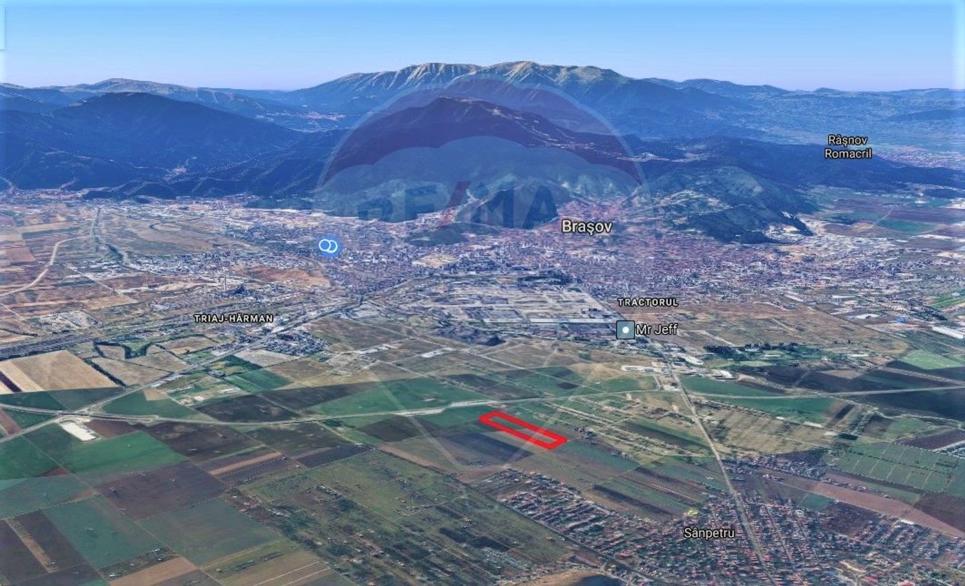 Compania RE/MAX Central va ofera in vederea achizitiei in sistem de reprezentare exclusiva si comision 0% din partea cumparatorului un teren in suprafata de 23900mp situat la intrarea in comuna Sanpetru, imediat dupa centura ocolitoare a Brasovului, pe partea dreapta. Zona se afla in plina dezvoltare imobiliara, in ultimii ani fiind construite sute de noi locuinte.