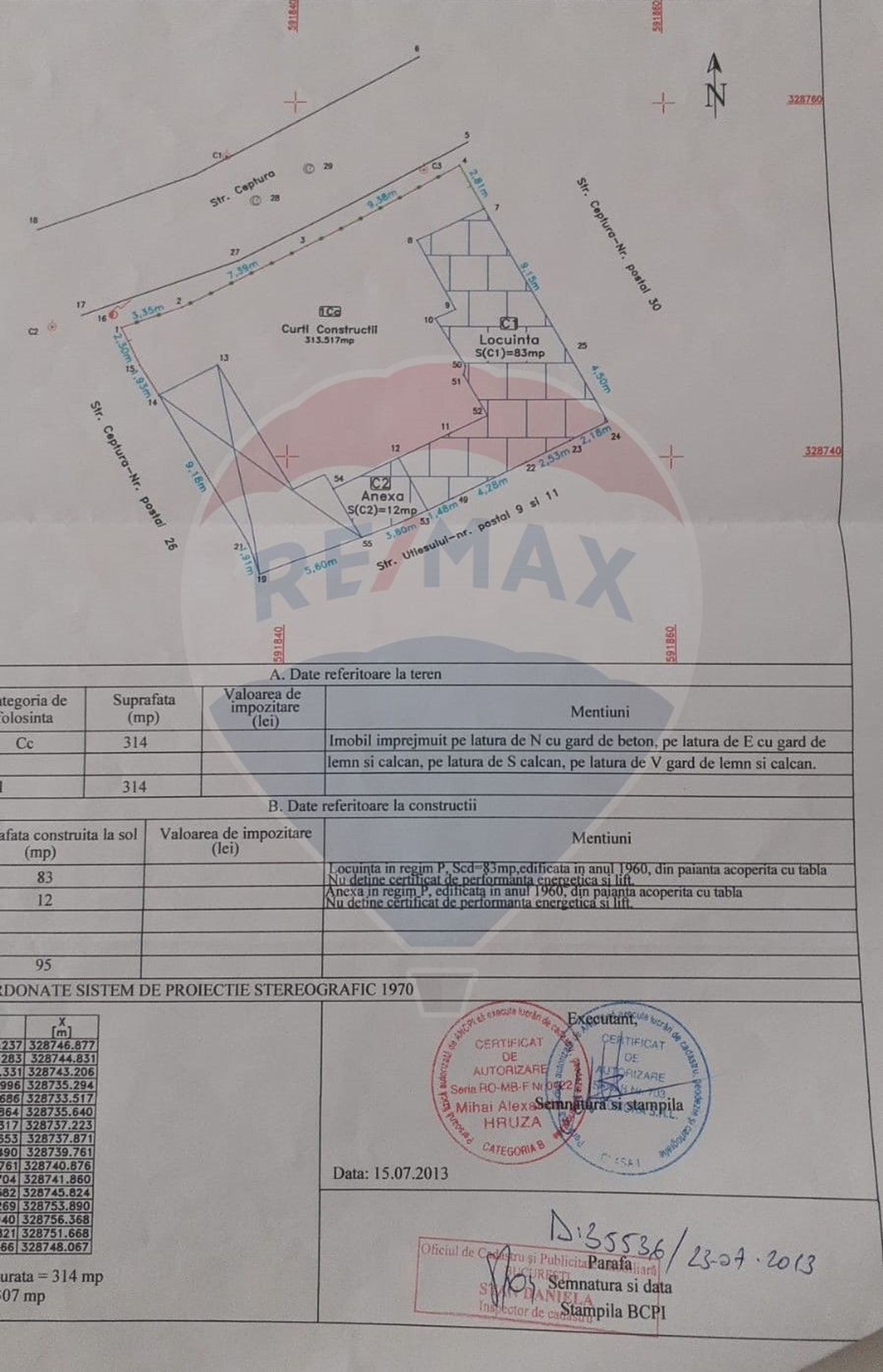 Pe amplasamentul in cauza se afla contruita si o casa si anexa cu suprafata de 83mp casa si respectiv 12 mp anexa. Locuinta este regim parter P cu suprafata construita de 83 mp edificata in anul 1960, este din paianta acoperita cu tabla.