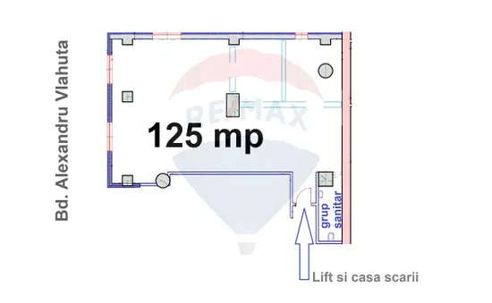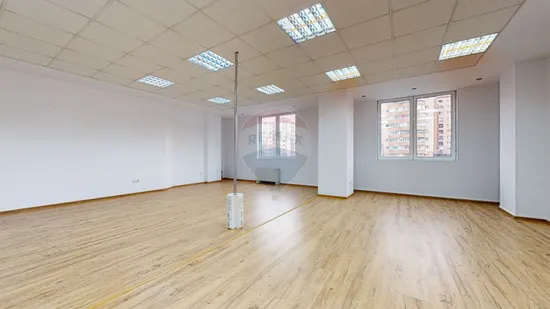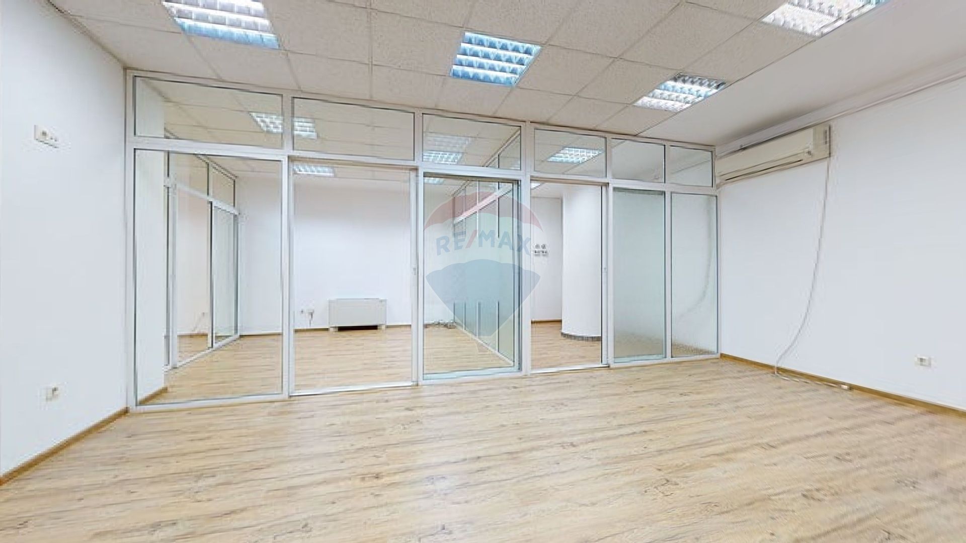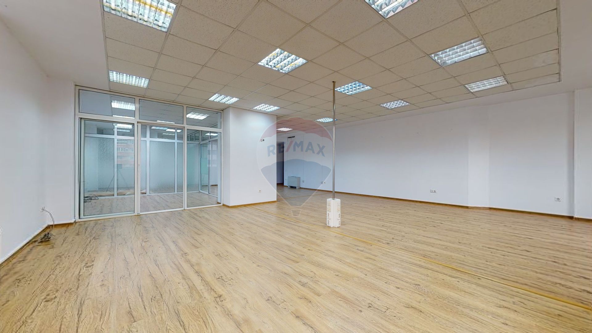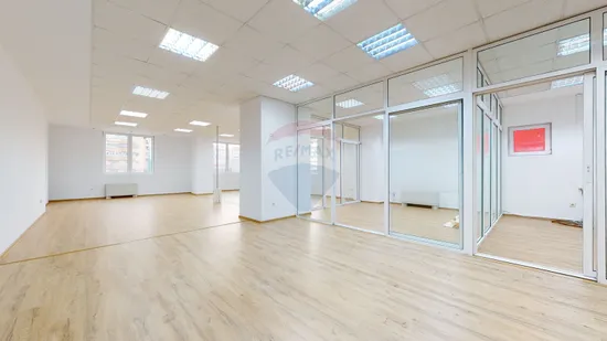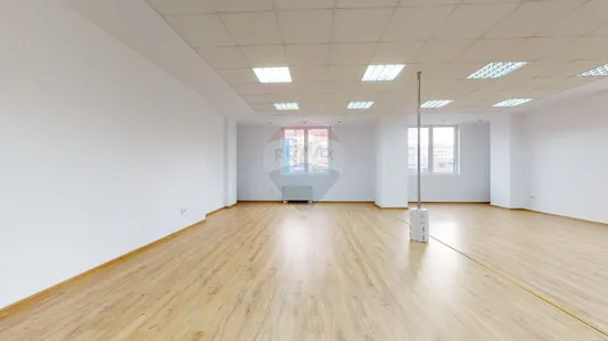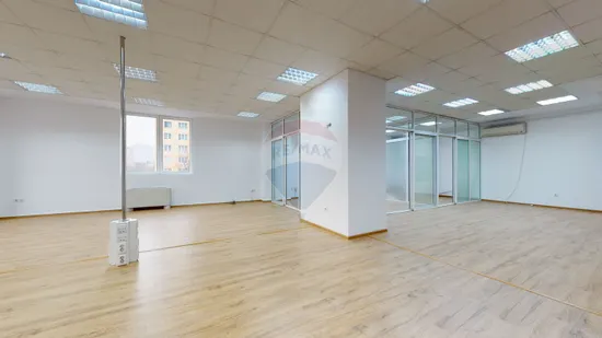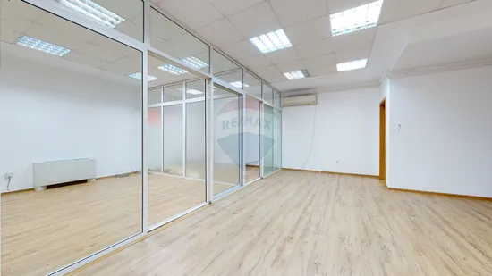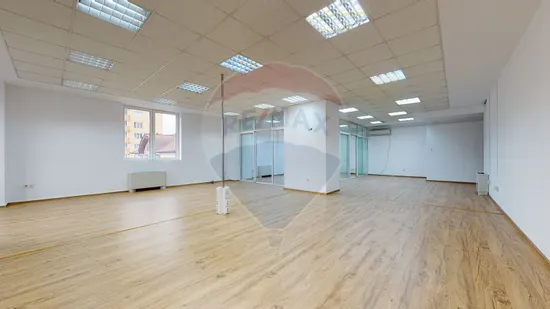 Biroul de închiriat se află la etajul 2, accesul făcându-se din hol comun. Suprafața de închiriat, 125 mp, compartimentat cu perete de sticlă open-space și 2 birouri de protocol cu perete de sticlă. Înălțime interioară birou 2,4 m. Beneficiază de un grup sanitar. Spațiul de închiriat are ferestrele spre bulevard, este luminos, orientat spre răsărit.