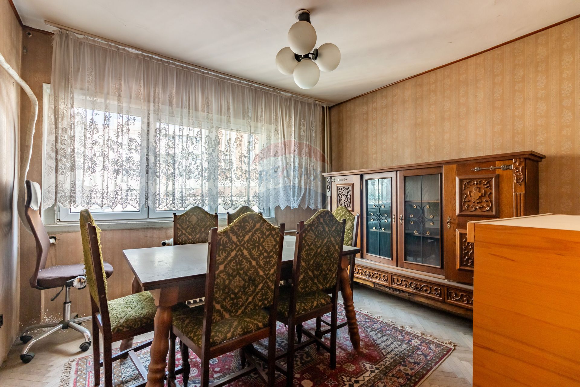The apartment is located on the 6th floor in an 8-storey building, located on Nicolae Titulescu Road. The block is thermally enveloped and is withdrawn from the boulevard so that the street noise is much muffled. The apartment is detached and needs renovation. The area allows immediate access to Victoriei Square and the northern area of the capital.
