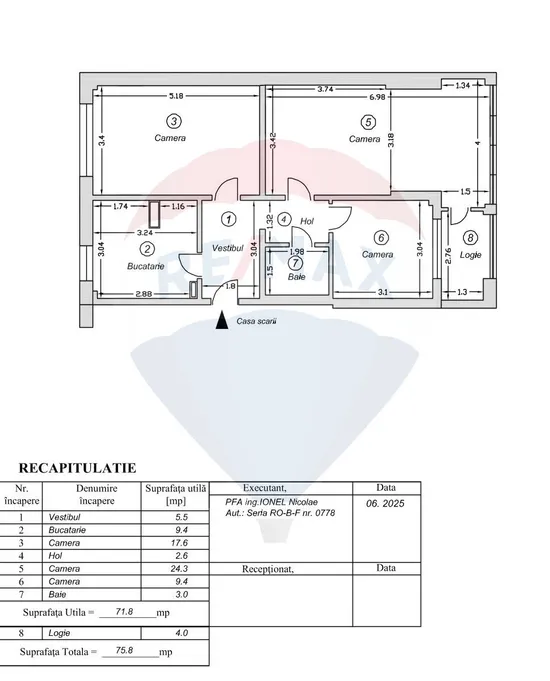 The usable surface is 75.8 square meters, which is at least 15% larger than most comparable apartments. The layout is decomandat (fully detached), functional and balanced, with large, bright, and well-organized spaces. It includes a generous living room of 24.3 sqm, two bedrooms of 17.6 sqm and 9.4 sqm, a spacious kitchen of 9.4 sqm, a bathroom, hallways, and a loggia. Additional space was gained through a legal extension, based on a construction permit and updated land registry documents.