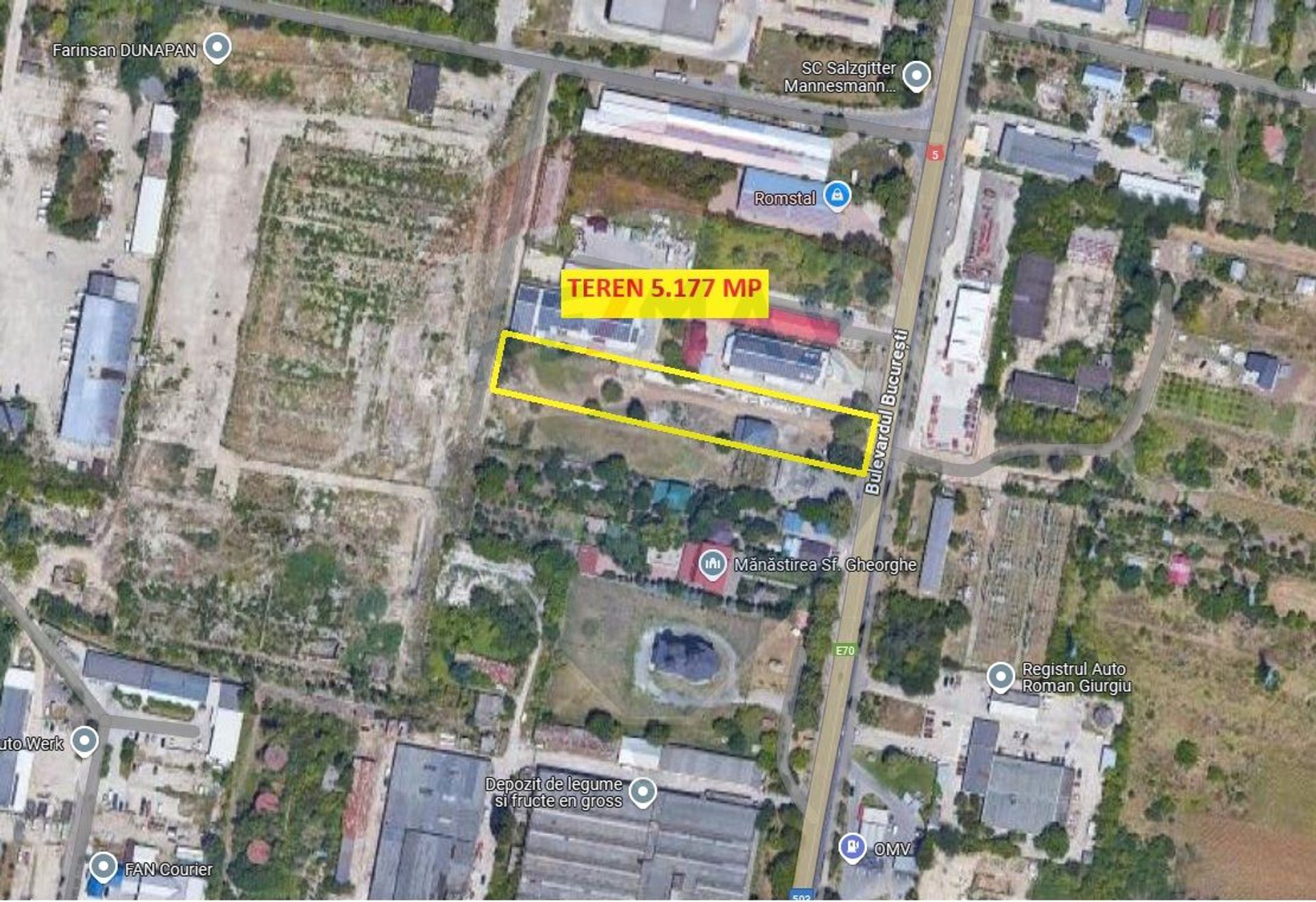 For sale: strategically located property at the northern entrance of Giurgiu, on Bucharest Boulevard, with 27.5 meters of frontage on the main road (DN5 – Bucharest–Giurgiu).