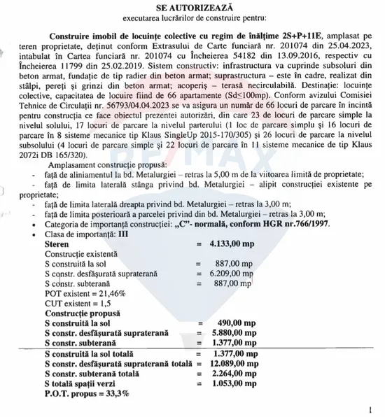 According to the Building Permit, the project aims to develop a modern residential building of collective housing, with a height regime of 2S + GF + 11 floors, located on bd. Metallurgiei, in an area with easy access to the main urban arteries.