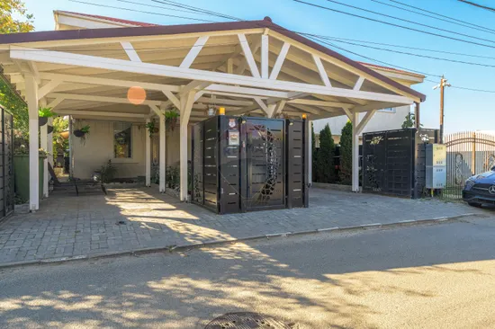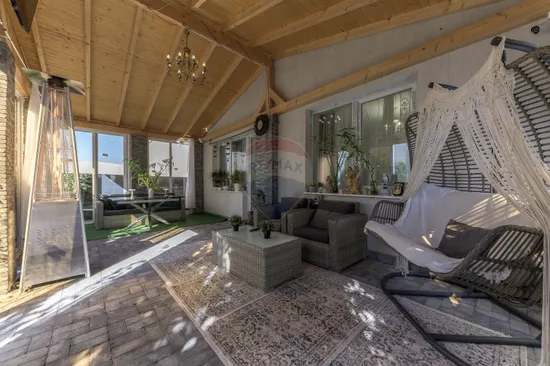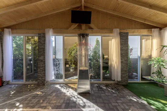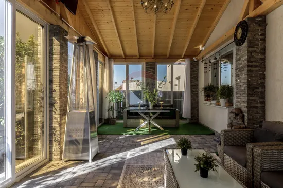 One of the most pleasant spaces of the house is the closed gazebo – an extension of the living area, built of natural wood and glass, designed as a summer living room. It is the perfect place for late breakfasts, evenings with friends or moments of relaxation, regardless of the season.