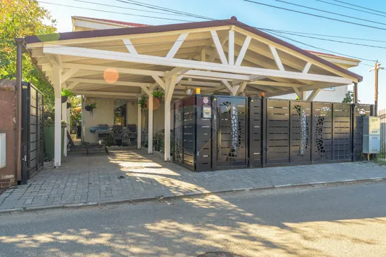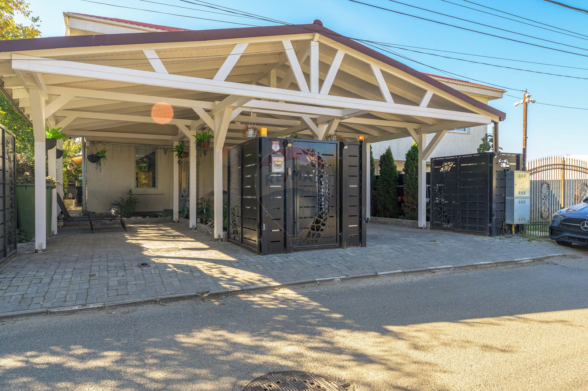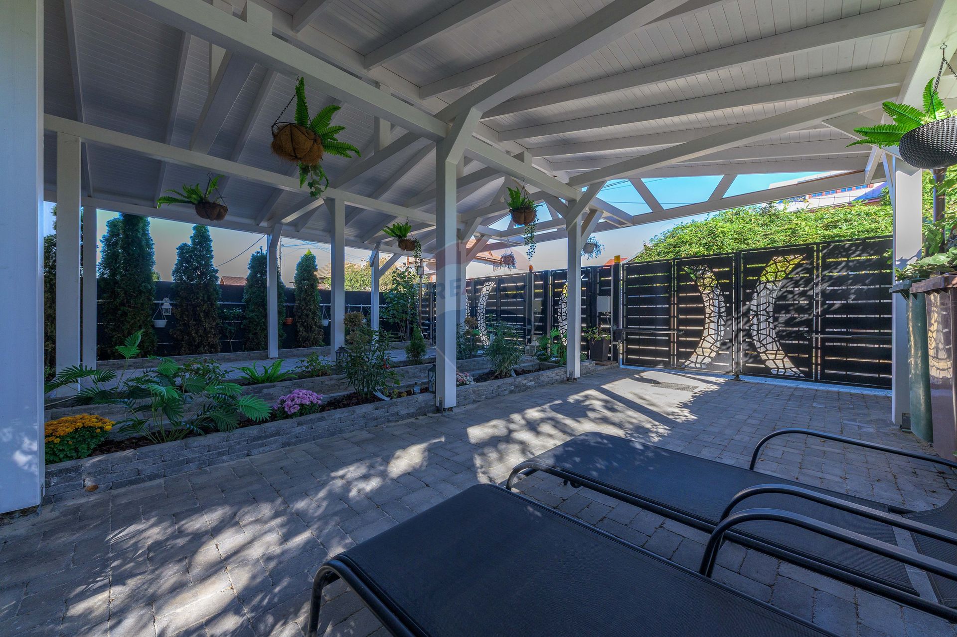 The exterior perfectly complements the overall picture: paved and neat courtyard, electric gates, covered parking and decorative green area, all integrated into a coherent and practical concept.