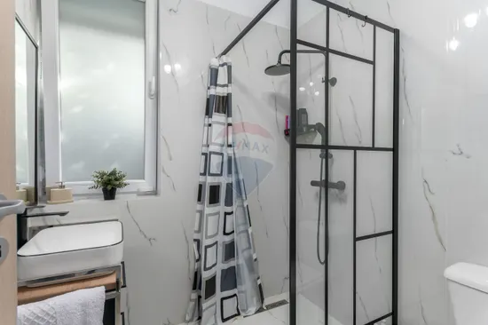The bathrooms have been completely renovated, with marble-inspired finishes, walk-in showers, modern sanitary ware and matte black accents that add depth and elegance.