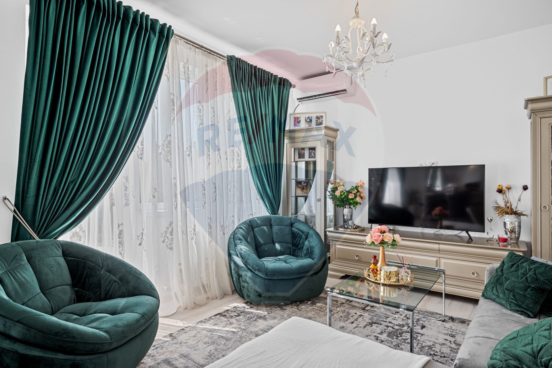 The living room with decorative fireplace, chandeliers and emerald green velvet curtains create an atmosphere of classic refinement reinterpreted modernly.