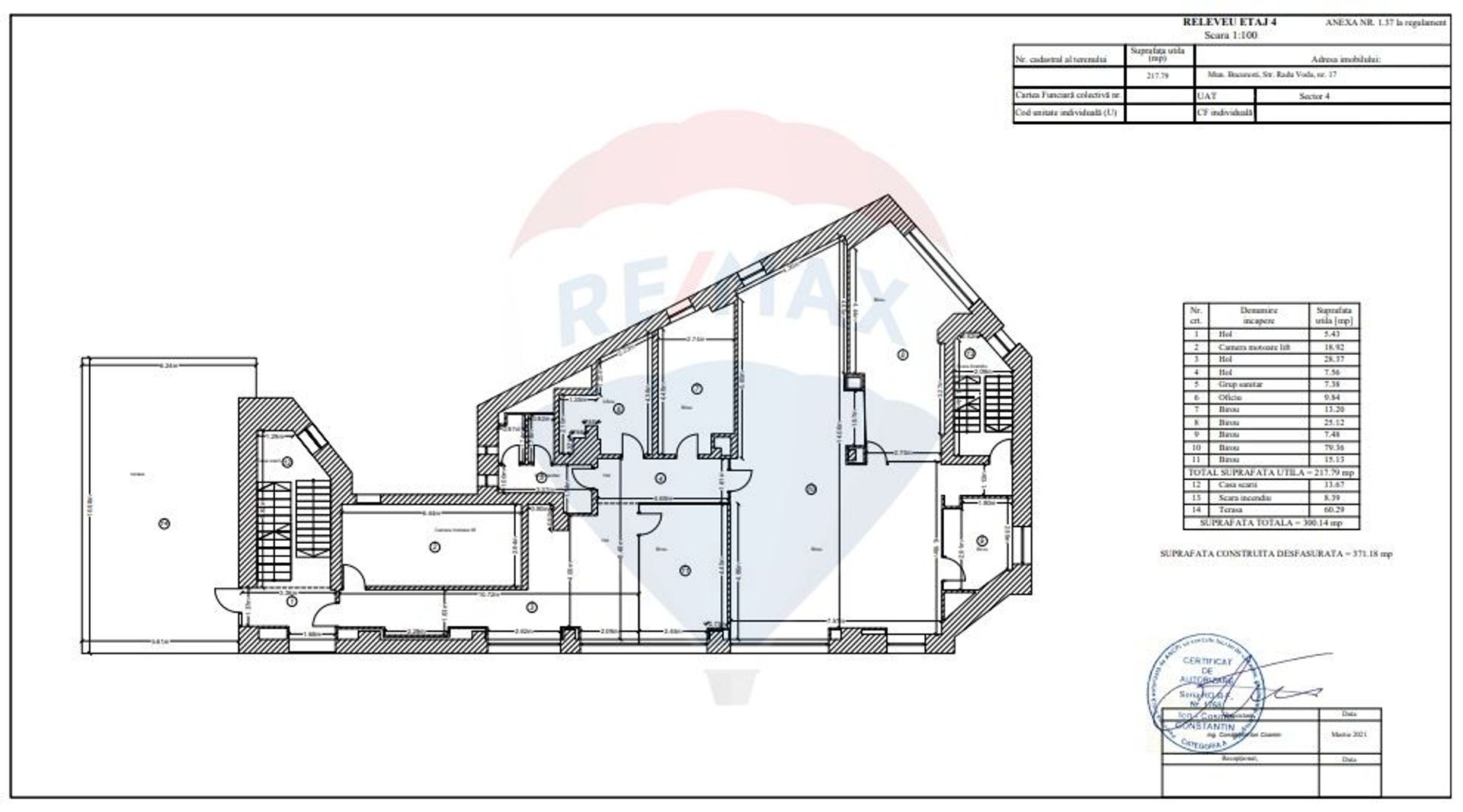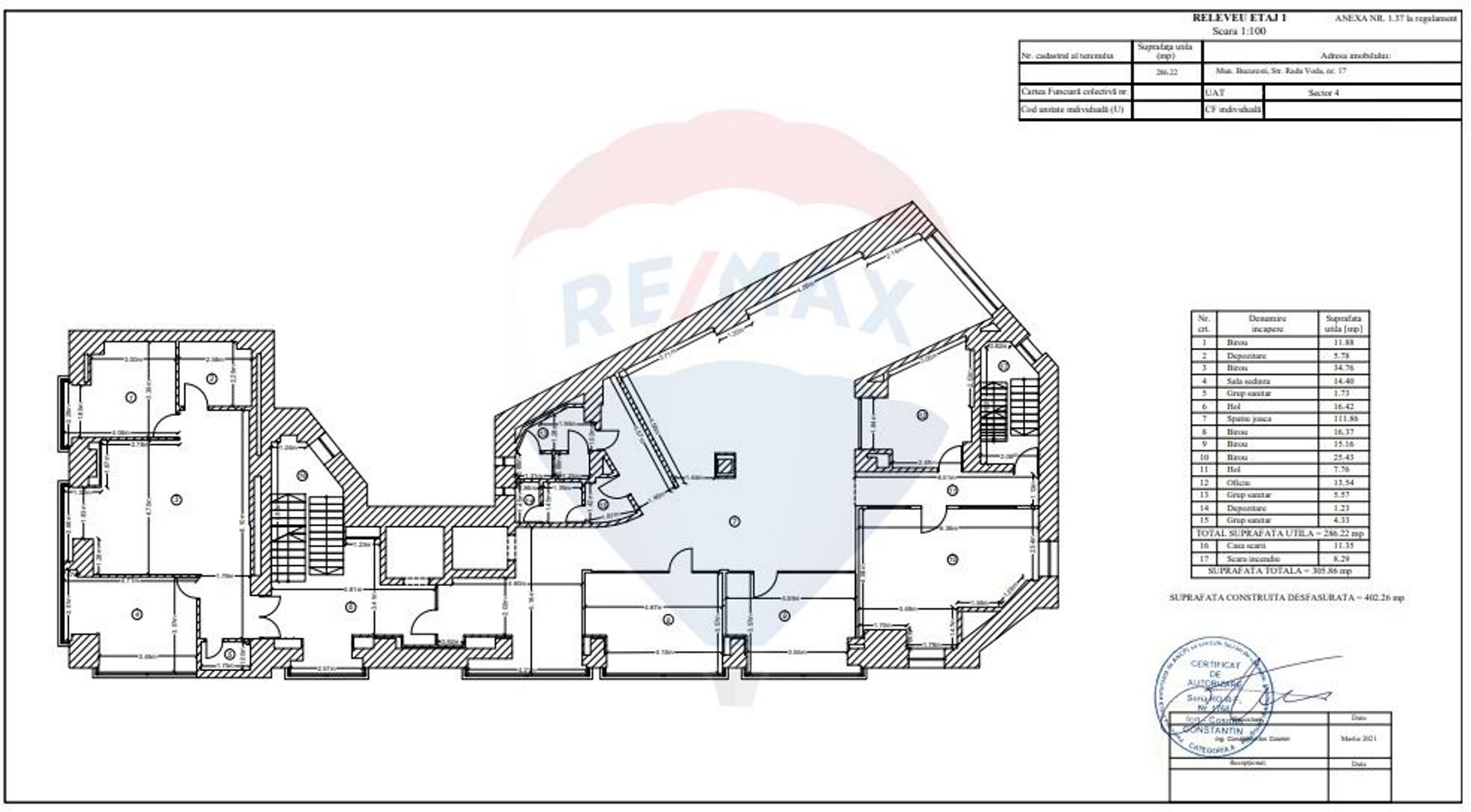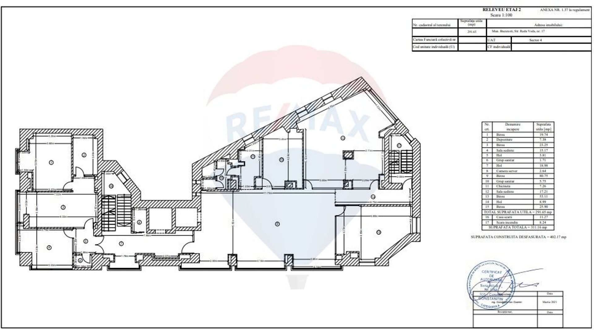 Office building BASEMENT-GROUND FLOOR-5 FLOORS AND TERRACE, located in the Unirii area, about 2 minutes walk from the Dimitrie Cantemir metro station. The building has easy access to the main arteries of the city and benefits from public transport in the immediate vicinity.