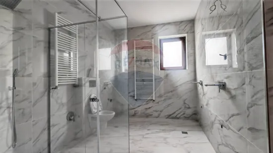 The construction, made of brick in 2015, has a height regime GF+1F, a built area on the ground of 315 sqm and a usable area of 437 sqm. It consists of two distinct housing units, connected to each other by the technical room, a configuration that allows the physical separation of the two bodies and their independent use, each having its own central heating system. This feature makes the property suitable for two families, for combined housing with professional activity or for exploitation for investment purposes.